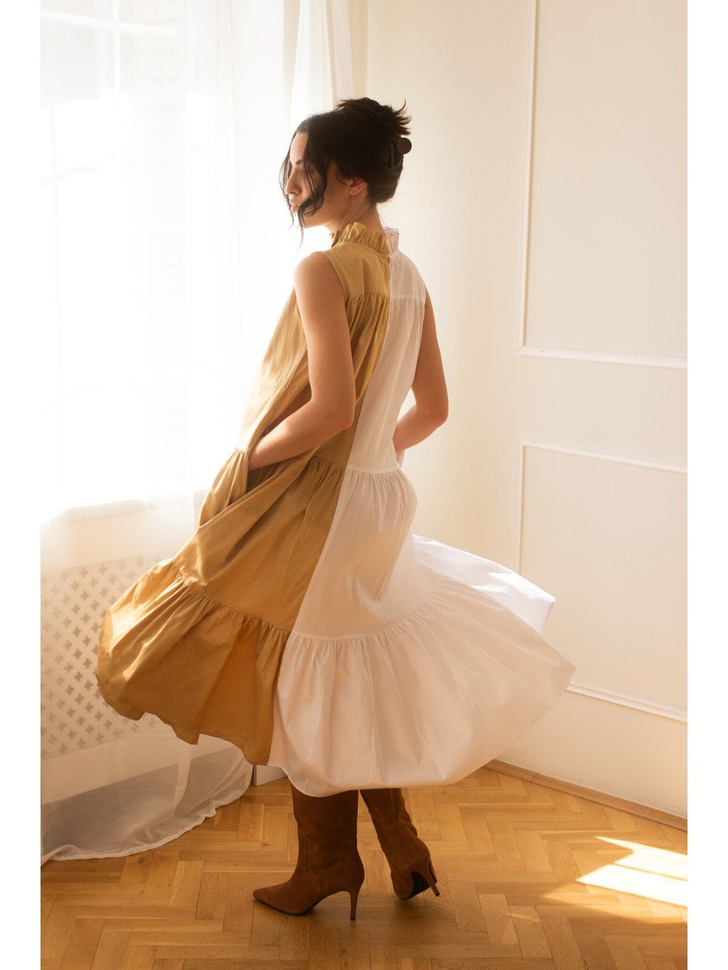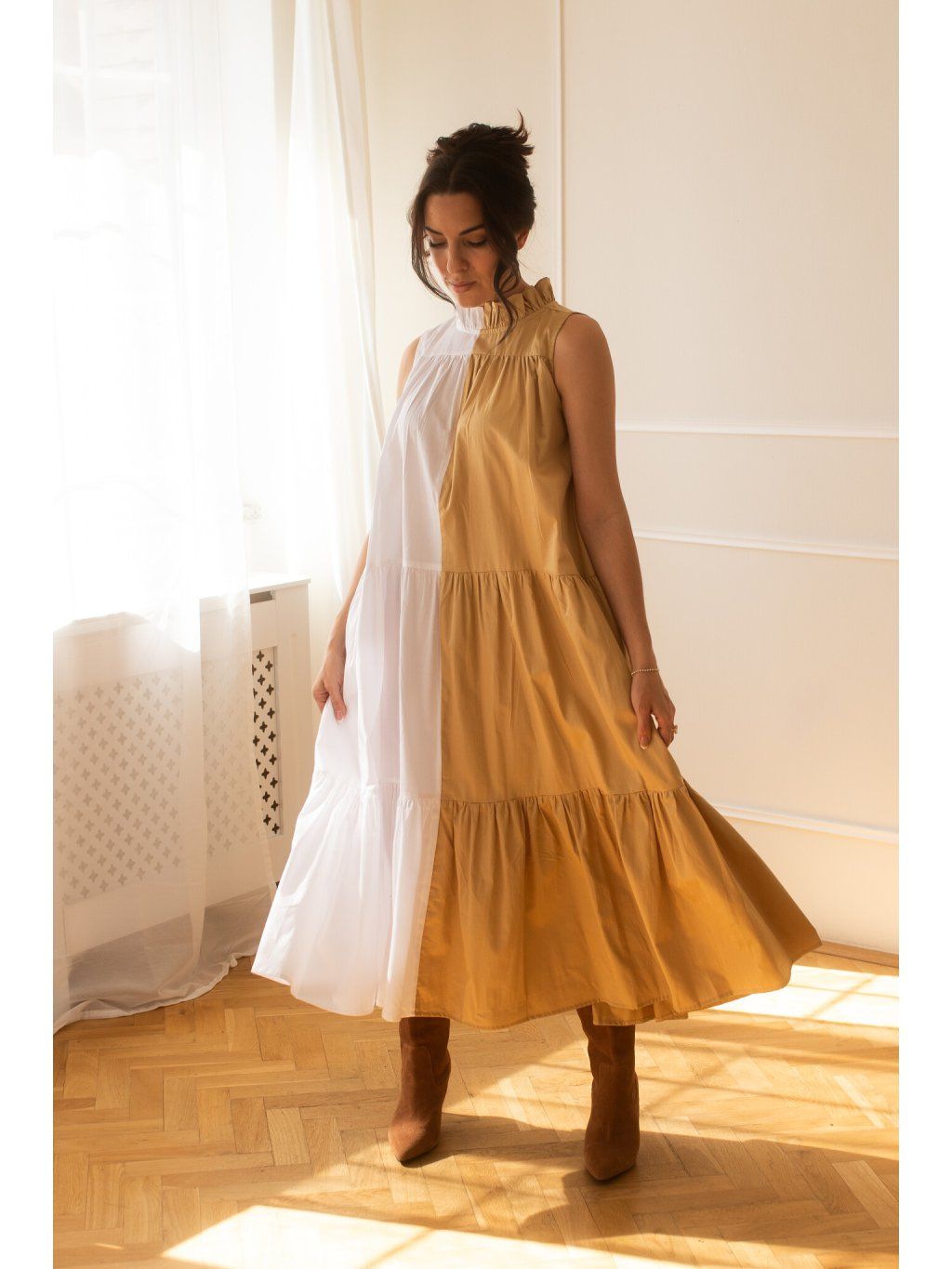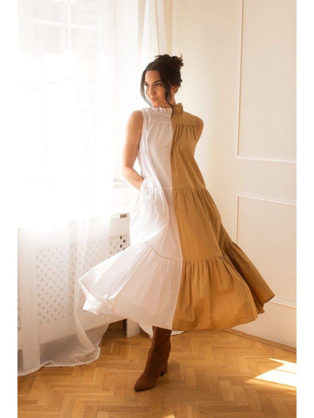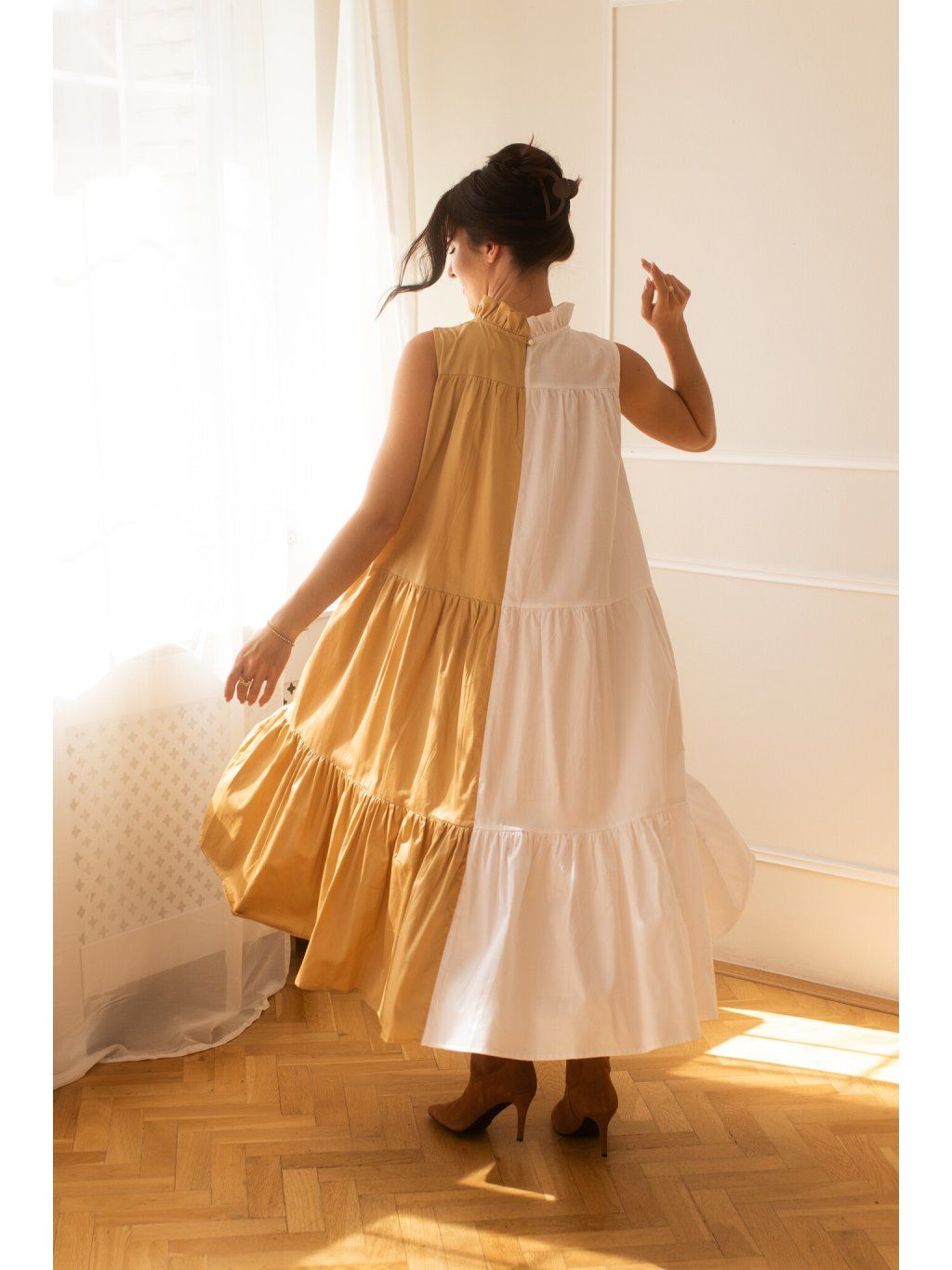 Šaty, které vyprávějí příběh dvou barev v dokonalé harmonii. Duet Maxi jsou jako letní den rozdělený mezi ranní svěžest a odpolední teplo slunce. Na jedné straně tě obejme jemná mléčná barva, čistá jako ranní rosa, na druhé straně tě zahřeje medová, hřejivá jako odpolední slunce. Ušité ze speciální glazované bavlny, která získala svůj charakteristický hedvábný lesk. Tato bavlna má větší gramáž, působí luxusněji a krásně padá. Když se jí dotkneš, ucítíš hladkou, téměř hedvábnou strukturu, která je příjemnější než obyčejná bavlna. Vysoký nabíraný límec rámuje tvůj dekolt s grácií a dodává šatům nádech sofistikovanosti, zatímco absence rukávů ti dává svobodu. Střih je mistrovské dílo jednoduchosti – tři řady volánů, které postupně zvětšují objem směrem dolů, vytváří siluetu, ve které se budeš cítit jako bohyně. Vzadu najdeš decentní zapínání na perleťový knoflík, který drží celou tu krásu pohromadě. A mají kapsy!