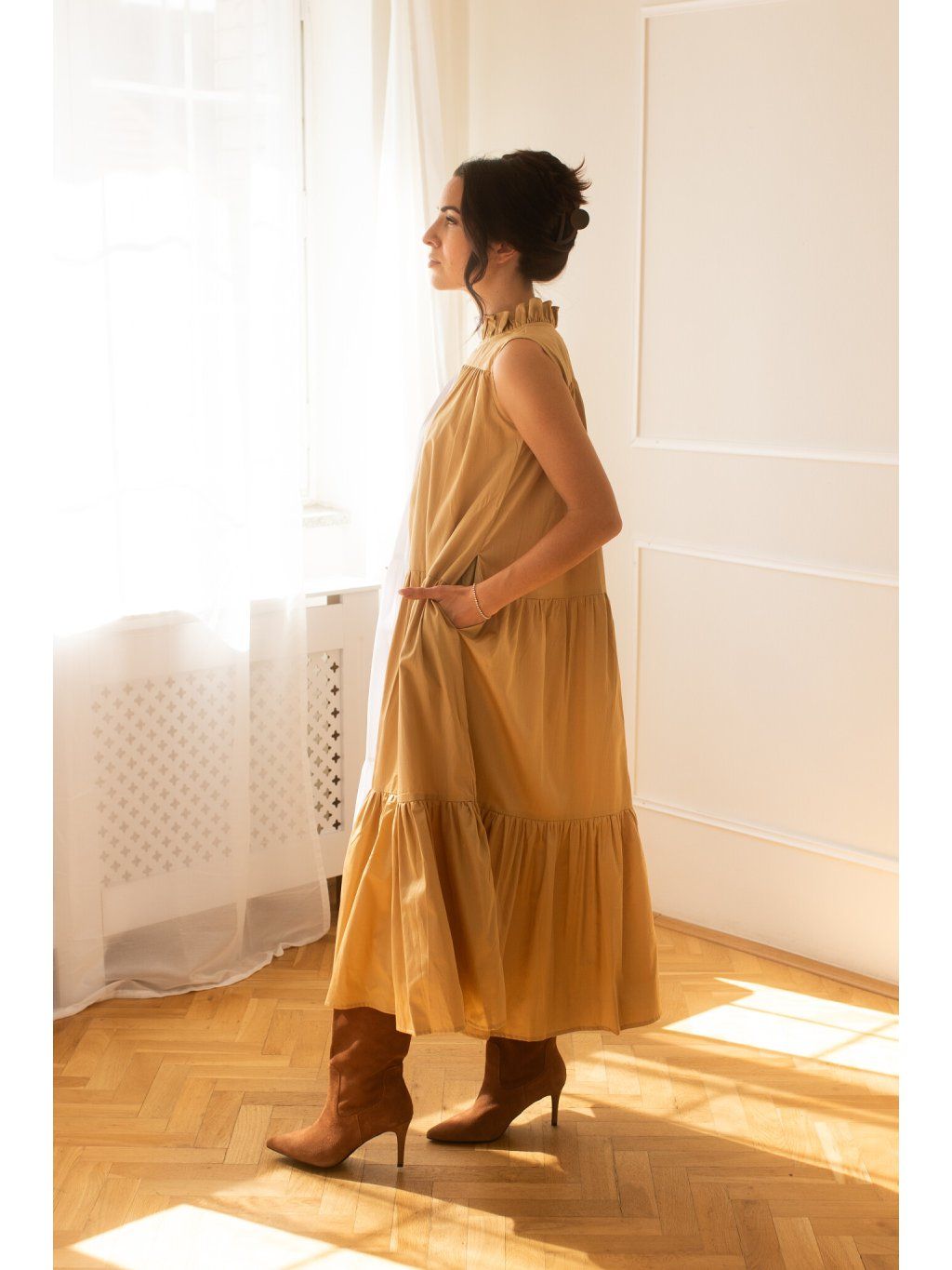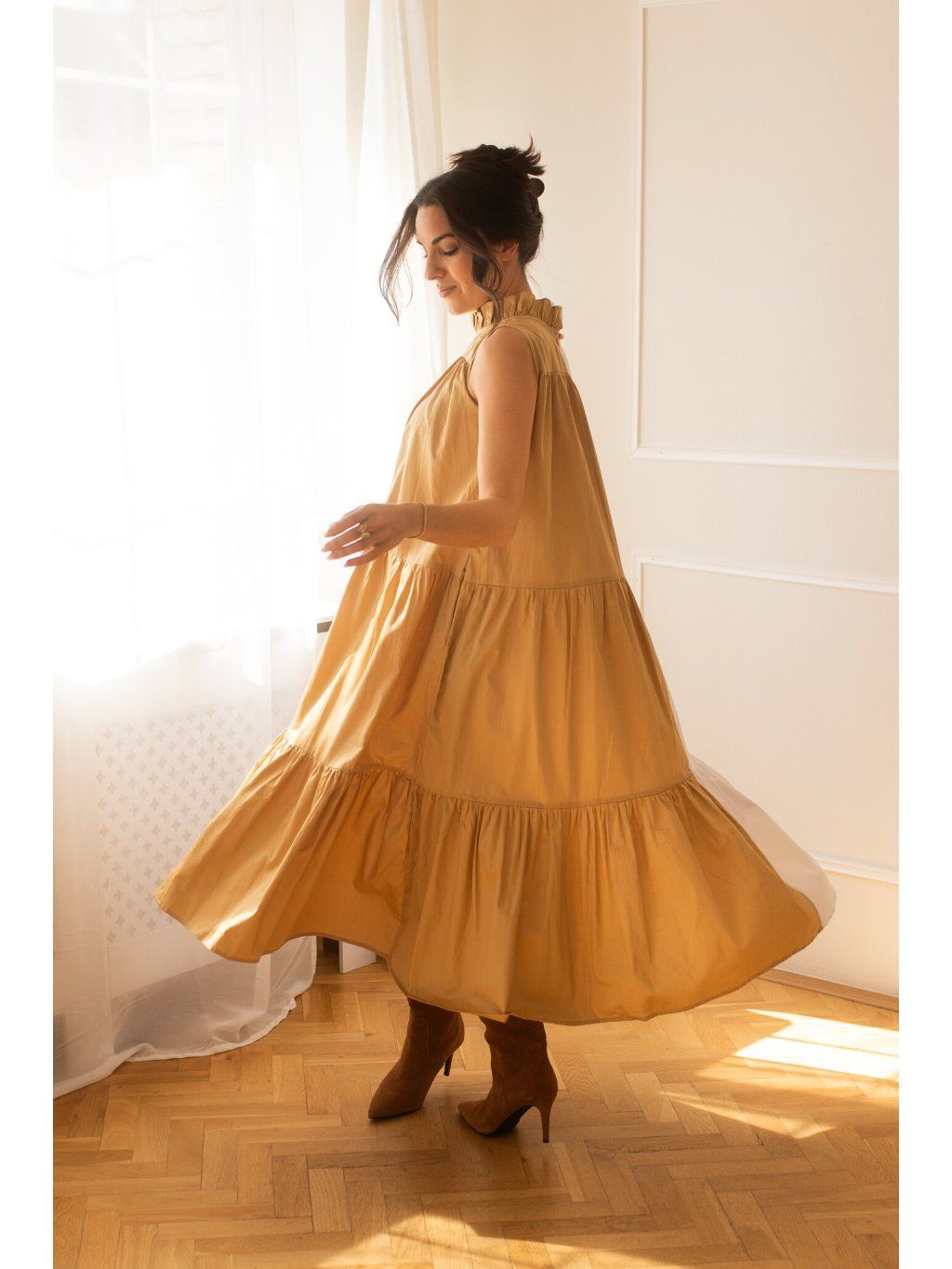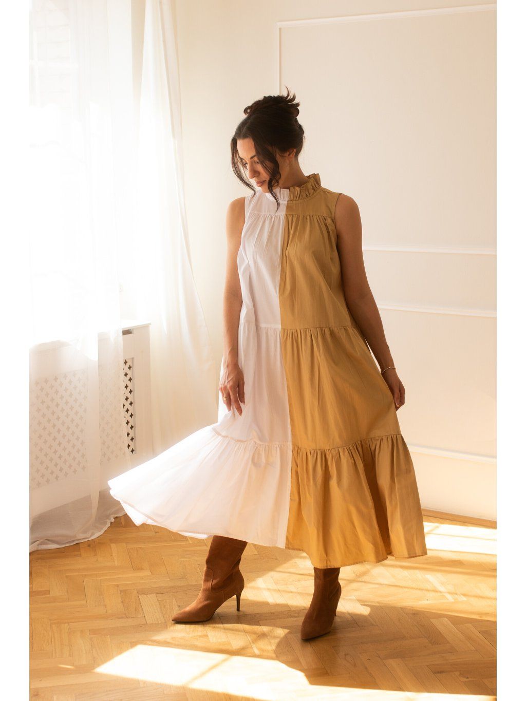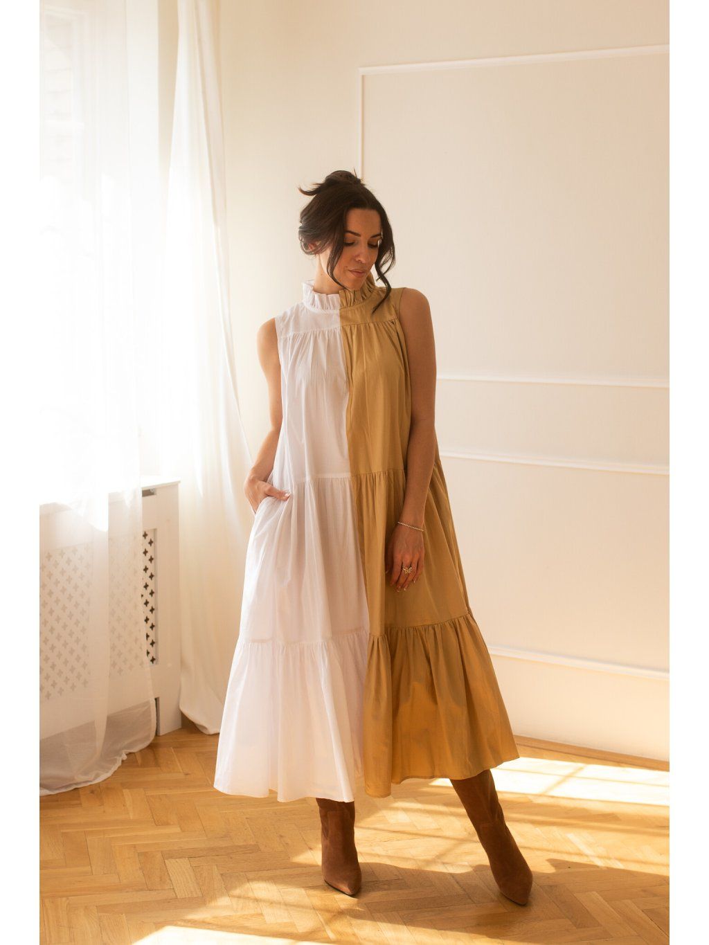 Šaty, které vyprávějí příběh dvou barev v dokonalé harmonii. Duet Maxi jsou jako letní den rozdělený mezi ranní svěžest a odpolední teplo slunce. Na jedné straně tě obejme jemná mléčná barva, čistá jako ranní rosa, na druhé straně tě zahřeje medová, hřejivá jako odpolední slunce. Ušité ze speciální glazované bavlny, která získala svůj charakteristický hedvábný lesk. Tato bavlna má větší gramáž, působí luxusněji a krásně padá. Když se jí dotkneš, ucítíš hladkou, téměř hedvábnou strukturu, která je příjemnější než obyčejná bavlna. Vysoký nabíraný límec rámuje tvůj dekolt s grácií a dodává šatům nádech sofistikovanosti, zatímco absence rukávů ti dává svobodu. Střih je mistrovské dílo jednoduchosti – tři řady volánů, které postupně zvětšují objem směrem dolů, vytváří siluetu, ve které se budeš cítit jako bohyně. Vzadu najdeš decentní zapínání na perleťový knoflík, který drží celou tu krásu pohromadě. A mají kapsy!