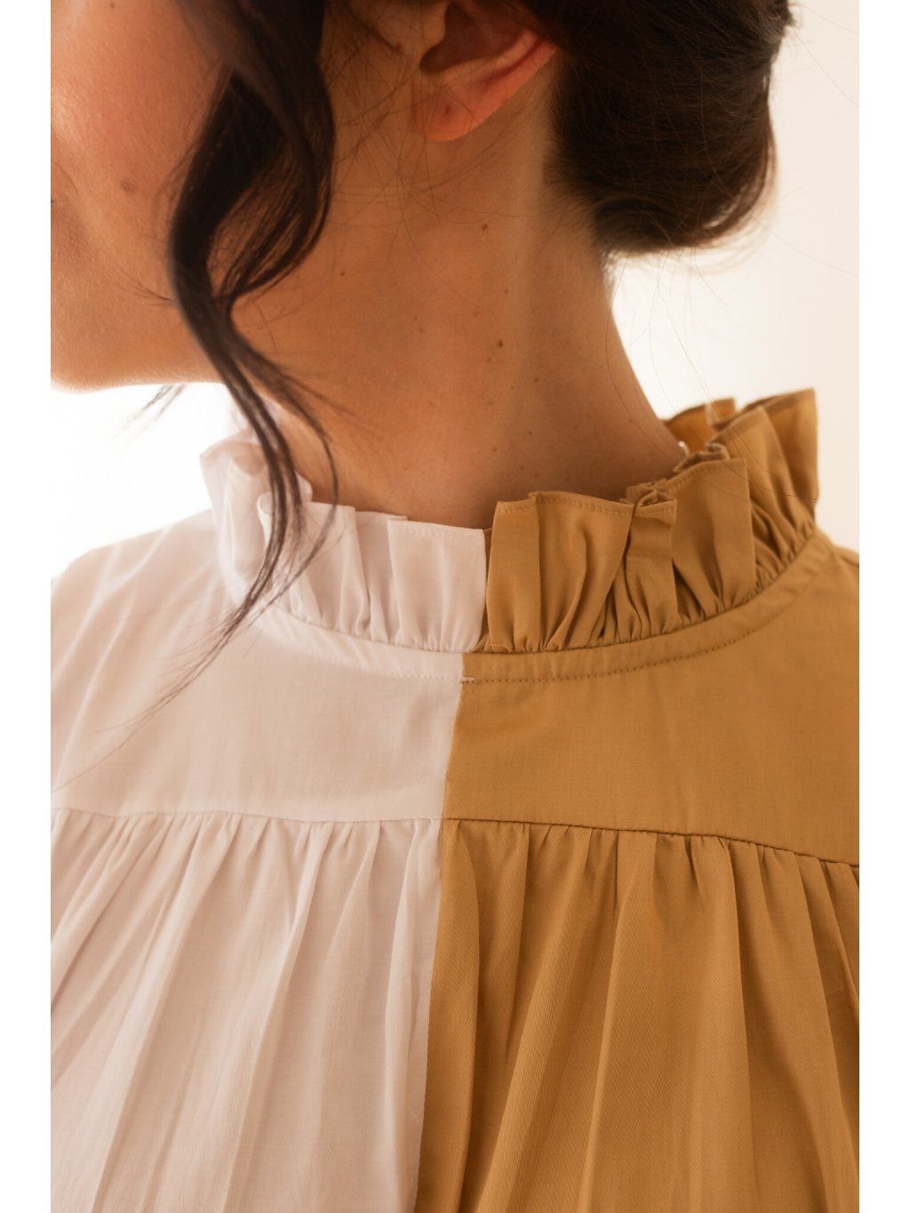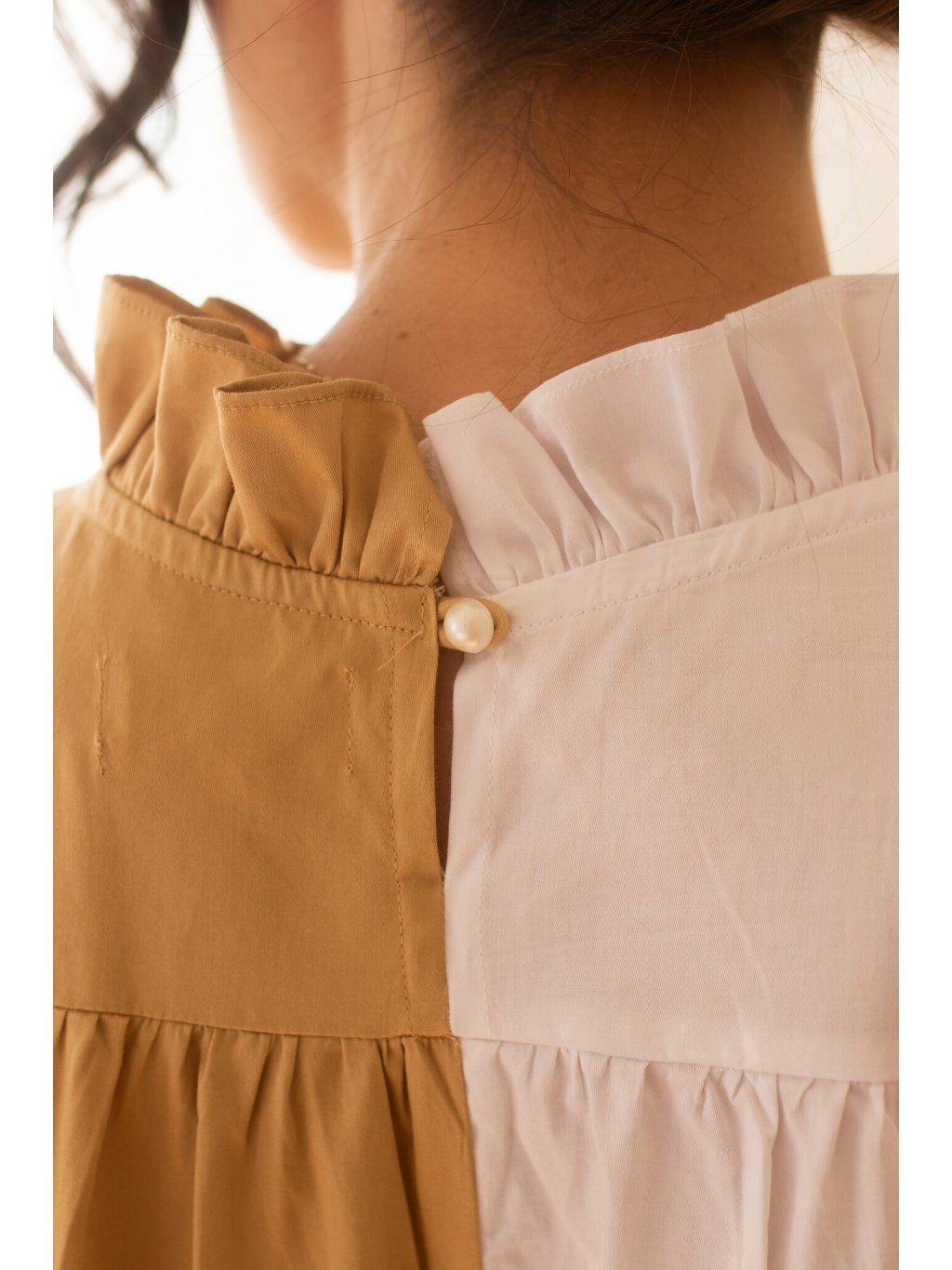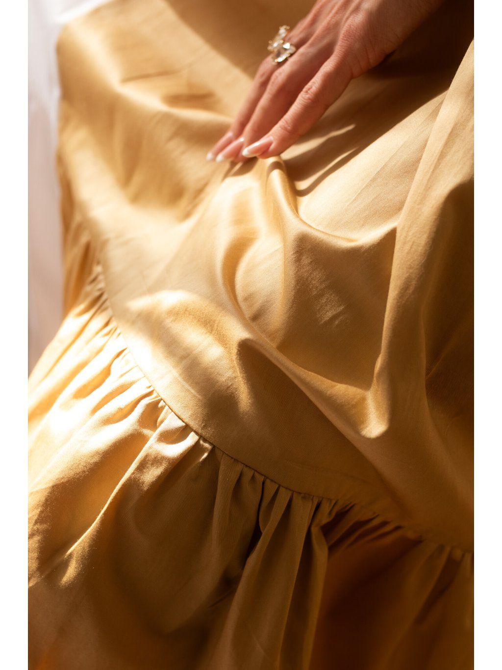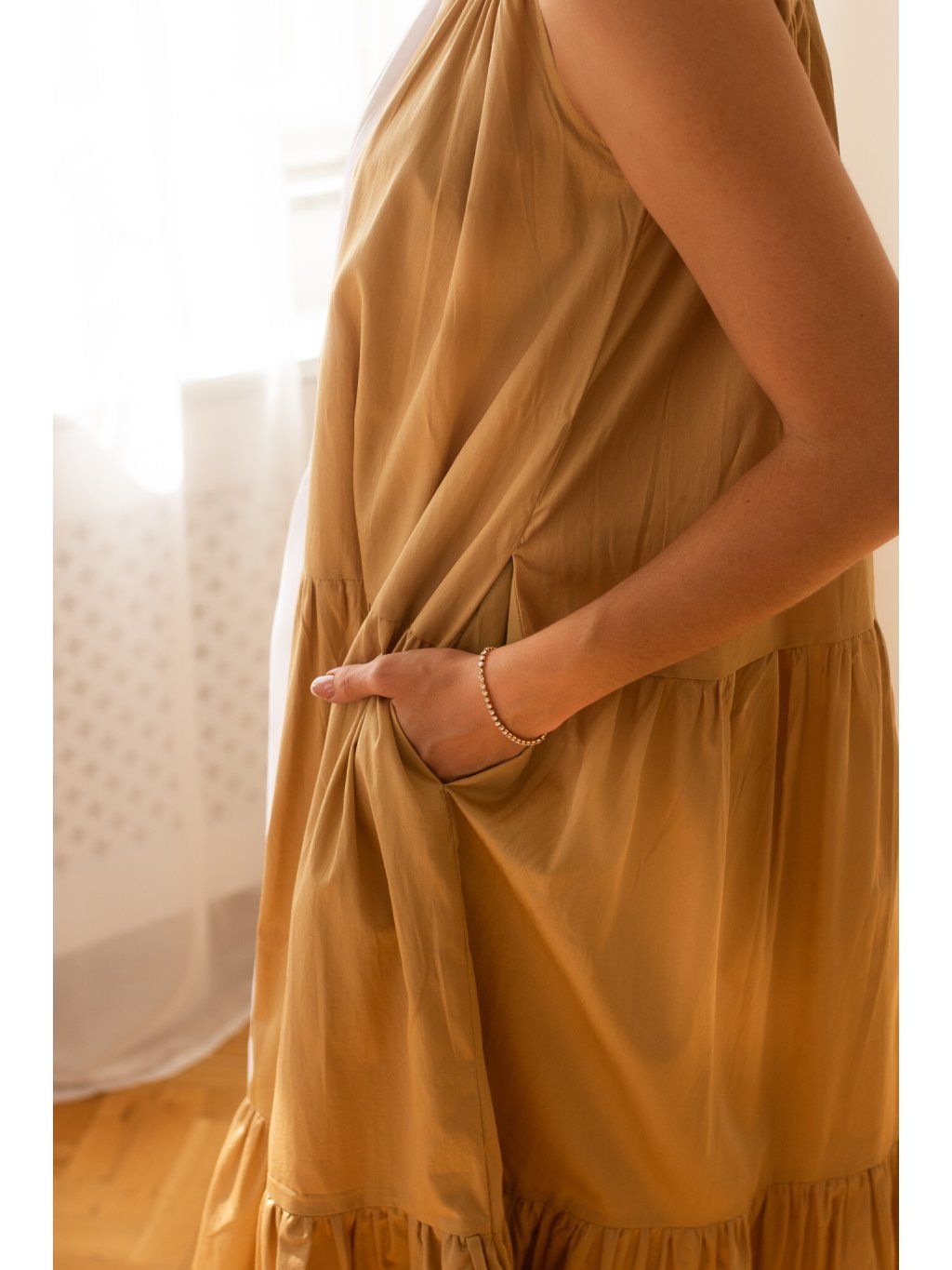 Šaty, které vyprávějí příběh dvou barev v dokonalé harmonii. Duet Maxi jsou jako letní den rozdělený mezi ranní svěžest a odpolední teplo slunce. Na jedné straně tě obejme jemná mléčná barva, čistá jako ranní rosa, na druhé straně tě zahřeje medová, hřejivá jako odpolední slunce. Ušité ze speciální glazované bavlny, která získala svůj charakteristický hedvábný lesk. Tato bavlna má větší gramáž, působí luxusněji a krásně padá. Když se jí dotkneš, ucítíš hladkou, téměř hedvábnou strukturu, která je příjemnější než obyčejná bavlna. Vysoký nabíraný límec rámuje tvůj dekolt s grácií a dodává šatům nádech sofistikovanosti, zatímco absence rukávů ti dává svobodu. Střih je mistrovské dílo jednoduchosti – tři řady volánů, které postupně zvětšují objem směrem dolů, vytváří siluetu, ve které se budeš cítit jako bohyně. Vzadu najdeš decentní zapínání na perleťový knoflík, který drží celou tu krásu pohromadě. A mají kapsy!